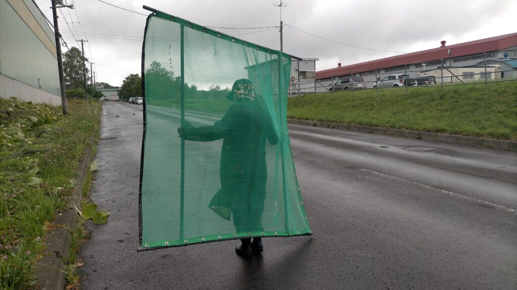 ハンドメイドの飛散防止ネット移動中の、BOSS。
